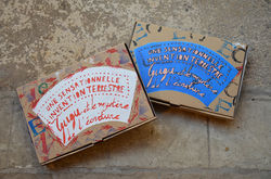Par la manipulation des teintes et des textures, ils ont exploré l'invention des signes et des symboles qui sont à l'origine de toutes les écritures et de tous les alphabets. Ces ateliers ont abouti à la création d'un jeu de narration dont les cartes ont été imaginées par les enfants d'après les lettres de l'alphabet, avec les techniques de la collographie, de la gravure sur carton Tetra Pak® et des encres aquarellables. Ces cartes ont été activées avec des parents d'élèves venus participer aux ateliers. Ils ont contribué à inventer des histoires et à les illustrer avec les enfants en classe. Des personnages et une trame narrative se sont alors dégagés progressivement de cette série d'ateliers, pour aboutir à l'élaboration d'un coffret-jeu intitulé Une sensationnelle invention terrestre : Gugu et le mystère de l'écriture.